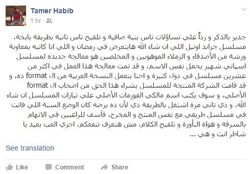 نشر السيناريست تامر حبيب عبر فيس بوك بوست يرد فيه على الاتهامات التي واجهته بسرقة مسلسل "جراند أوتيل"