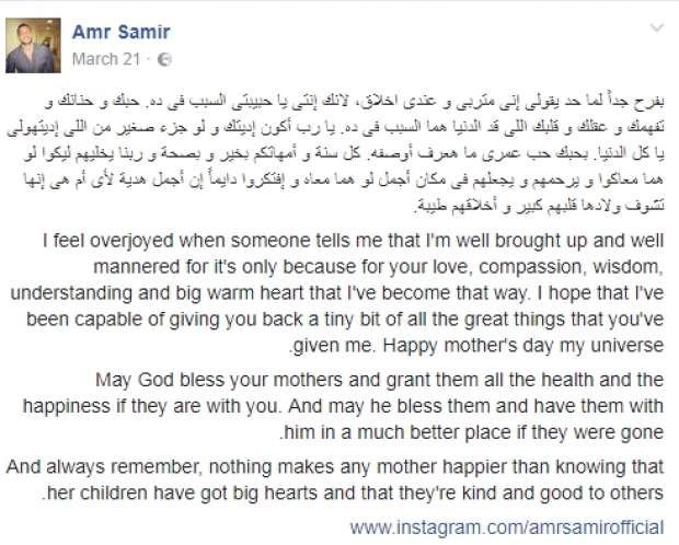 ونشر عمرو بعض الصور التي تجمعه بوالدته في مراحل عمريه مختلفة واختتم رسالته لها بقوله : "بحبك حب عمري ما هعرف أوصفه" وقدم التهنئة لكل أمهات مصر وقال: "كل سنة وأمهاتكم بخير وبصحة وربنا يخليهم ليكوا لو هما معاكوا ويرحمهم ويجعلهم في مكان أجمل لو هما معاه
