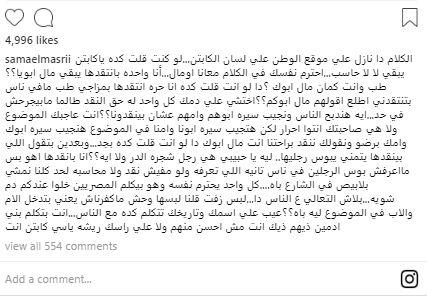 واختتمت سما: “بلاش التعالى ع الناس دا.. لبس زفت قلنا لبسها وحش.. ما كفرناش يعنى بتدخل الأب والأم فى الموضوع ليه بأه ؟؟ عيب على اسمك وتاريخك تتكلم كده مع الناس.. أنت بتكلم بنى آدمين زيهم، أنت مش أحسن منهم، ولا على راسك ريشة ياسى كابتن انت”.