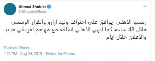 وكتب شوبير عبر صفحته الشخصية على موقع التواصل الاجتماعي "تويتر": "رسميا الاهلي يوافق علي احتراف وليد ازارو والقرار الرسمي خلال 48 ساعه كما انهي الاهلي اتفاقه مع مهاجم افريقي جديد والاعلان خلال أيام".