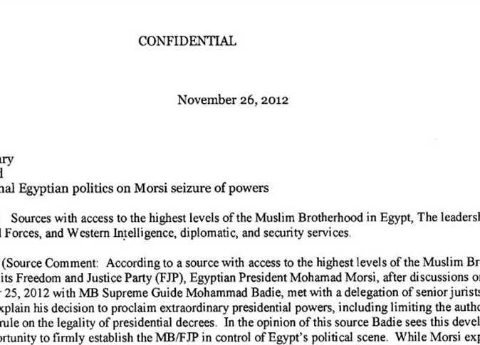 ففي إيميل بعنوان 26 نوفمبر عام2012، وتحت عنوان «سري..السياسة الداخلية المصرية بشأن استحواذ مرسي على السلطة»، أرسل شخص مجهول تقريرا مفصلا عن معلومات سرية نقلها عن مصدر مطلع بأعلى مستويات في جماعة الإخوان المسلمين وحزب الحرية والعدالة.