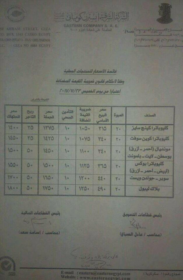 أعلنت الشركة الشرقية للدخان "ايسترن كومبانى"، عن تعديل أسعار البيع للمستهلك لبعض منتجات الشركة من أصناف السجائر اعتبارا من اليوم الخميس ، وفقا لأحكام قانون ضريبة القيمة المضافة رقم 67 لسنة 2016.