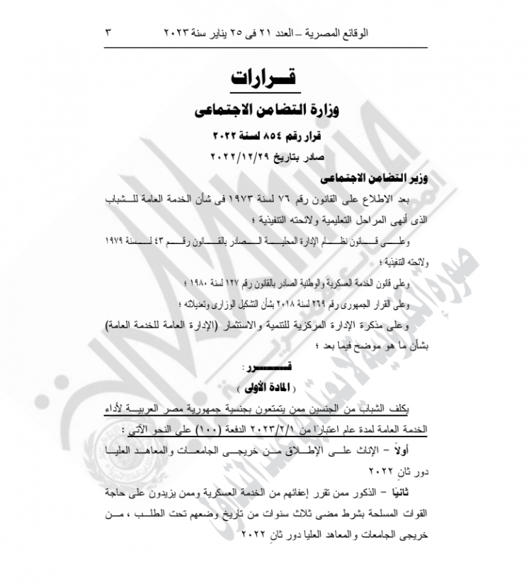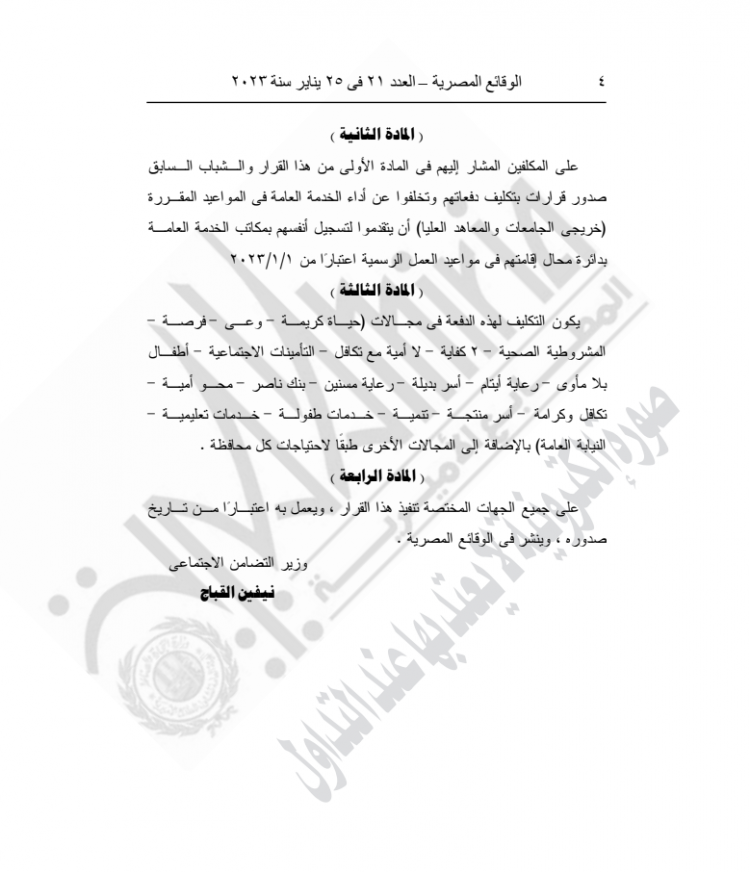 نشرت الجريدة الرسمية اليوم الأربعاء، قرار وزيرة التضامن نيفين القباج، بشأن تكليف الشباب من الجنسين ممن يتمتعون بالجنسية المصرية لأداء الخدمة العامة اعتبارا من 1/2/2023.