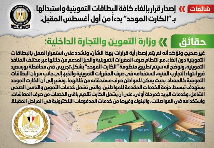 انتشر فى الساعات القليلة الماضية شائعة اصدار قرار بإلغاء جميع البطاقات التموينية واستبدالها بـ"الكارت الموحد" بدءا من أول أغسطس القادم،مما أدى إلى قيام المركز الإعلامي بمجلس الوزراء باصدار بيان للرد على ما أثير بخصوص هذا الشأن.