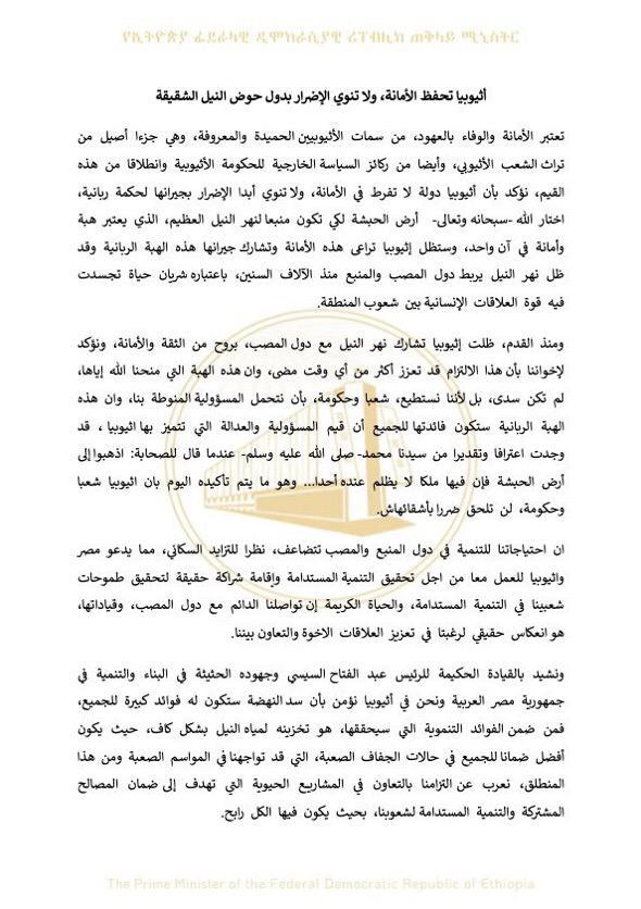 أكد رئيس الوزراء الإثيوبي أبي أحمد، اليوم السبت،في بيان باللغة العربية نشره على صفحته الشخصية بمواقع التواصل الإجتماعي على إلتزامه بعدم الإضرار بمصر والسودان في مياه النيل.