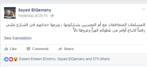 دعا المفكر سيد القمني السيدات المسلمات في مصر للتضامن مع السيدة القبطية المسنة التي عراها نحو 30 رجلا في المنيا وذلك بخلع الحجاب، قائلا على حسابه الشخصي في موقع "فيسبوك" للتواصل الاجتماعي "المسلمات المتعاطفات مع أم المصريين يشاركونها ويرموا حجابهم في الشارع علني رفضا لاتباع أوامر من غطوكم قهرا وعروها ذلا".