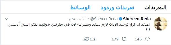وبررت طلبها هذا بأن أصوات بعض المؤذنين مزعجة. وكتبت: "أعتقد أن قرار توحيد الآذان لازم يتنفذ وبسرعة لأن في مقرئين صوتهم يكفر البني آدمين".